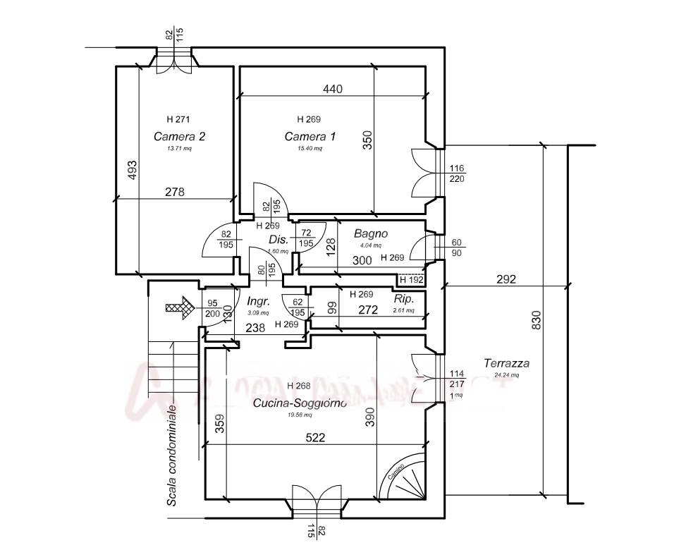Si accede all'immobile tramite scala condominiale e risulta essere composto da: ingresso, un locale cucina / soggiorno, un ripostiglio, un disimpegno, un bagno padronale, 2 camere di cui una matrimoniale, una terrazza scoperta oltre ad un locale deposito / rimessa separato posto nella corte interna al piano terra.